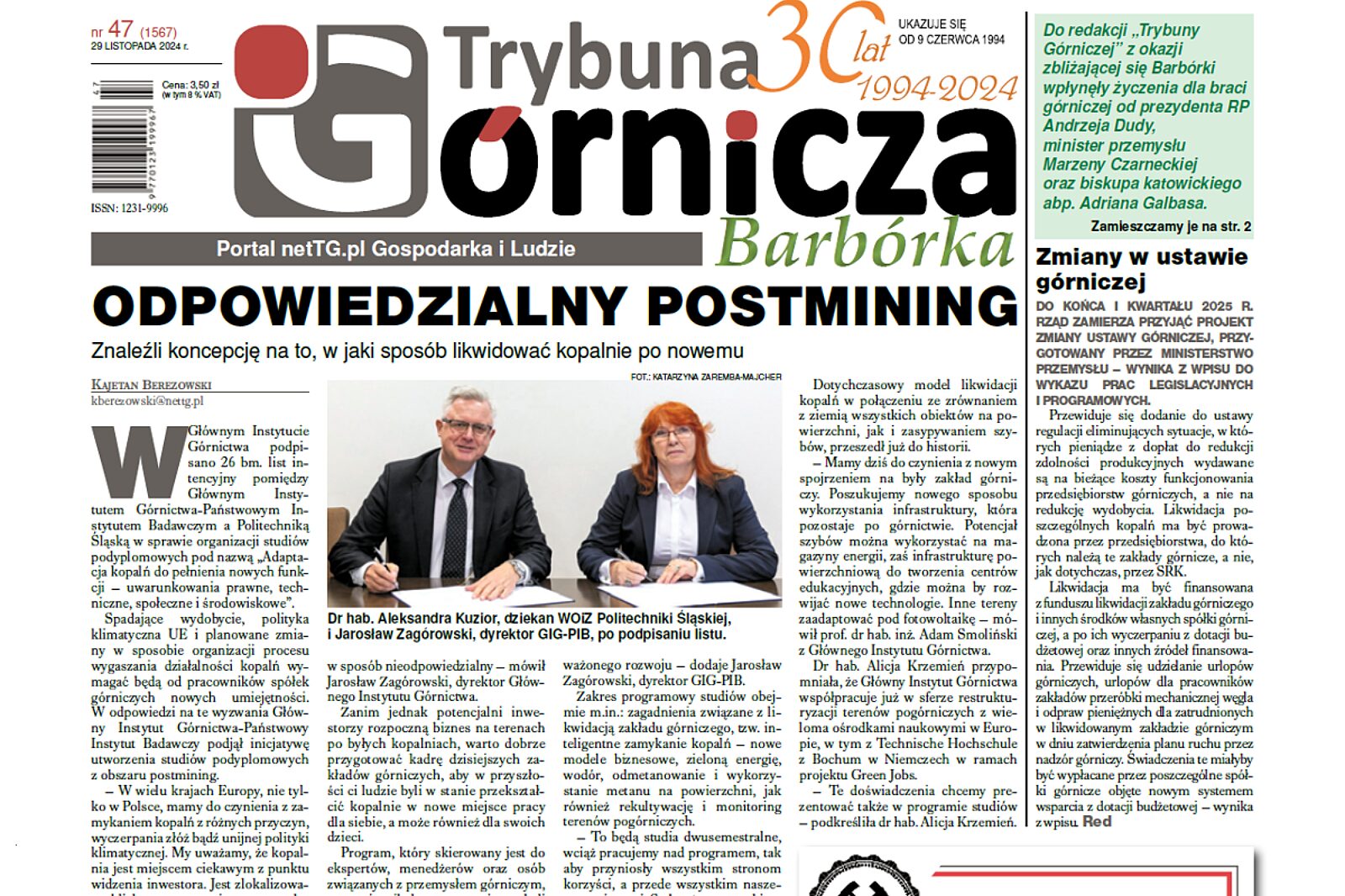 Materiał otwarcia w naszym tygodniku to relacja z podpisania listu intencyjnego między GIG-PIB a Politechniką Śląska dotyczący kształcenia wyjątkowych specjalistów. O co chodzi? - W wielu krajach Europy, nie tylko w Polsce, mamy do czynienia z zamykaniem kopalń z różnych przyczyn, wyczerpania złóż, bądź unijnej polityki klimatycznej. My uważamy, że kopalnia jest miejscem ciekawym z punktu widzenia inwestora. Jest zlokalizowana blisko centrum miasta, ma połączenie drogowe, energetyczne, bocznicę kolejową i zasób pracowników obytych z danym terenem, dobrze przygotowanych do pracy. Chcielibyśmy, aby nie były one likwidowany w sposób nieodpowiedzialny – mówi Jarosław Zagórowski, dyrektor Głównego Instytutu Górnictwa.