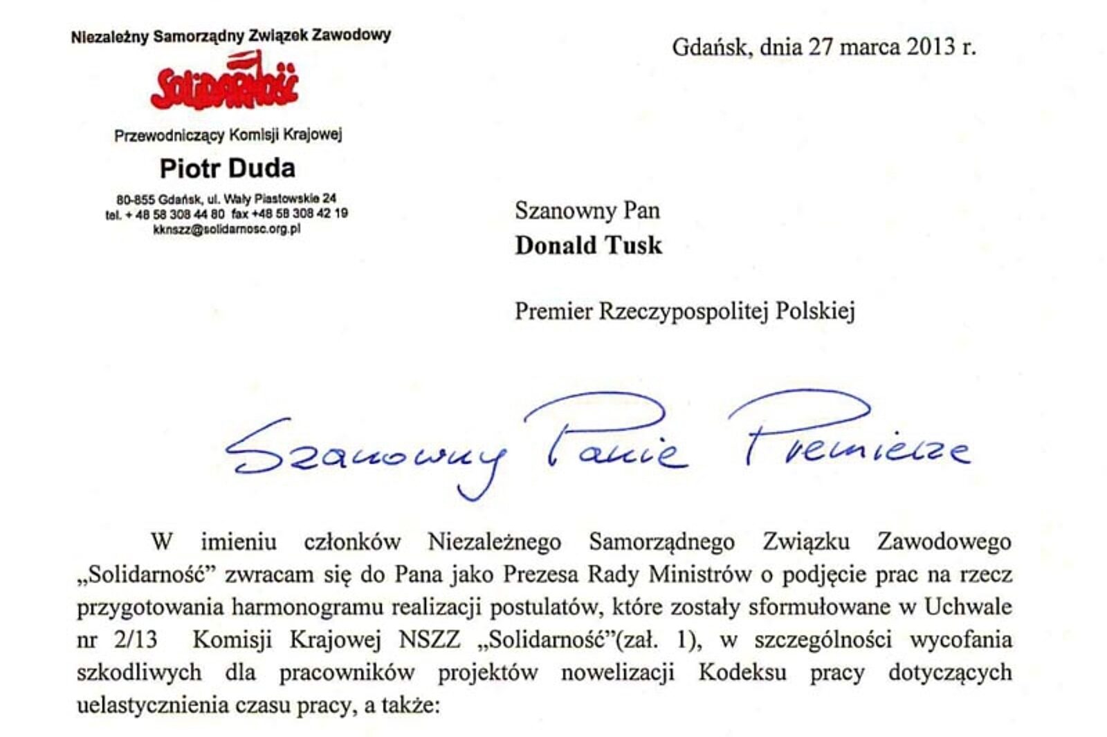 W liście, przewodniczący Duda - w imieniu Solidarności - domaga się także "podwyższenia wysokości płacy minimalnej zgodnie z projektem złożonym przez NSZZ Solidarność"