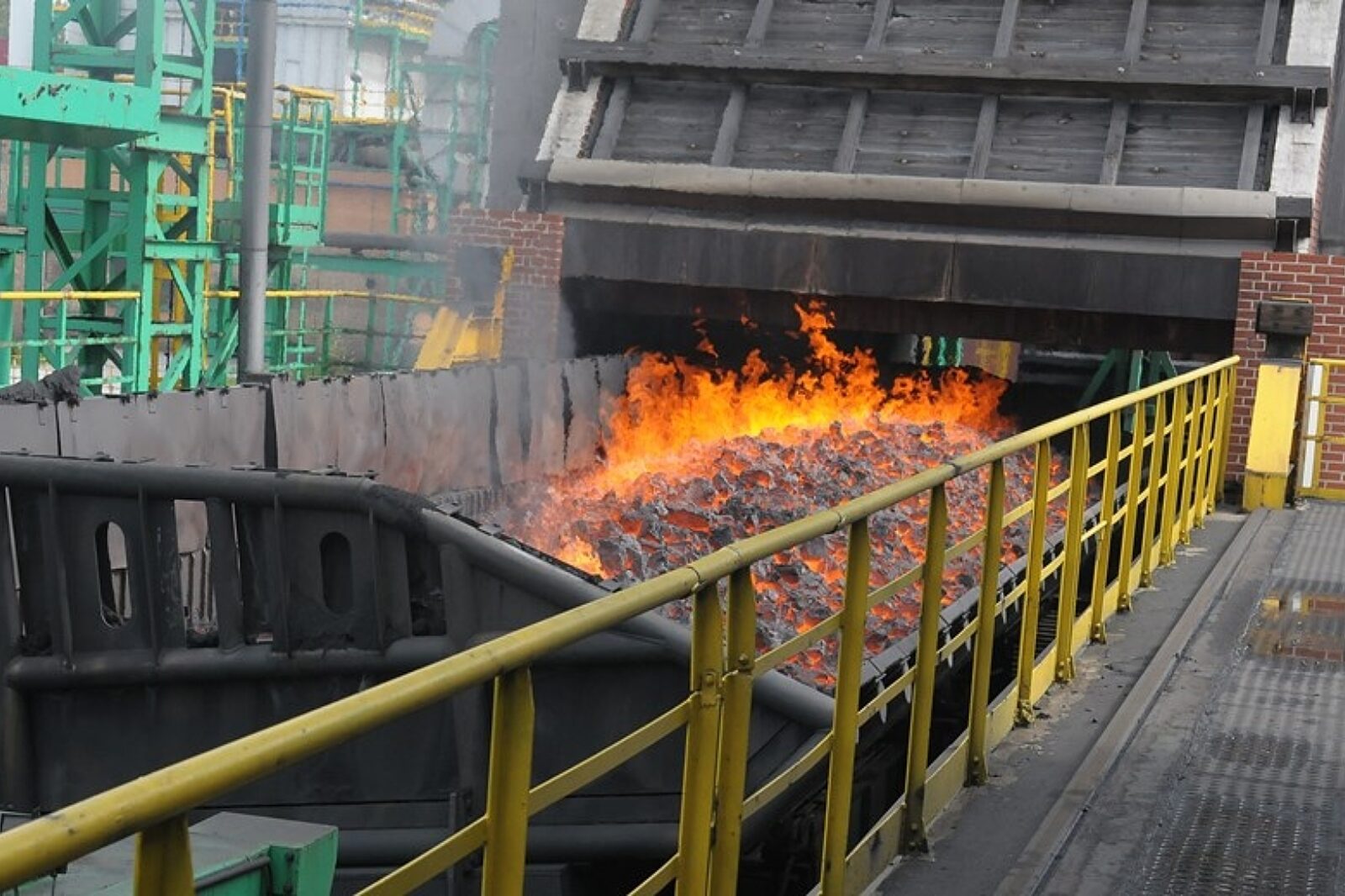 Po zakończeniu 16-godzinnego procesu koksowania i wypchania koksu z komory placek koksowy zostaje rozłożony na wozie przelotowym