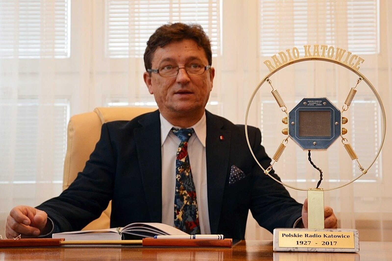 Piotr Ornowski, prezes zarządu Polskiego Radia w Katowicach, przed mikrofonem symbolizującym 90-lecie rozgłośni
