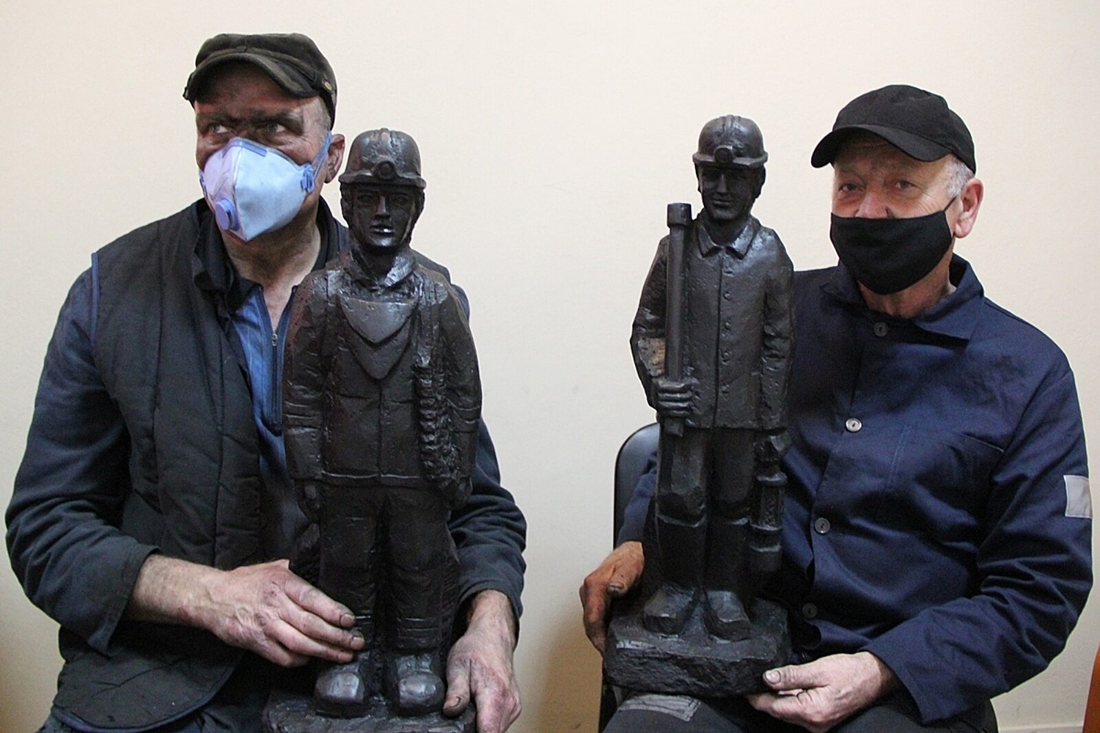 Kazimierz Mucha i Janusz Matejczyk prezentują postacie górników wykonane w węglu