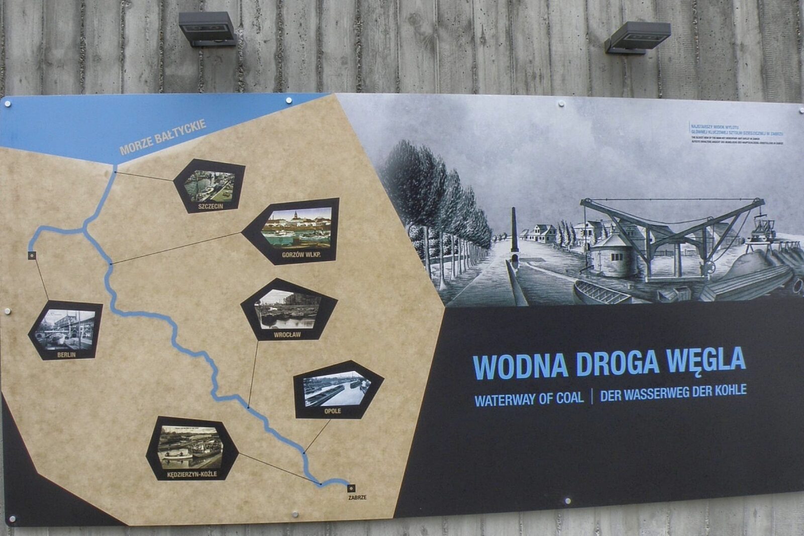 Przy linii symbolizującej przebieg Kanału Kłodnickiego i Odry widnieją grafiki z wizerunkami miast. Pierwsze jest Zabrze, a ostatni Szczecin. Pomiędzy nimi widnieją kolejno: Kędzierzyn Koźle, Opole, Wrocław oraz... Gorzów Wielkopolski.