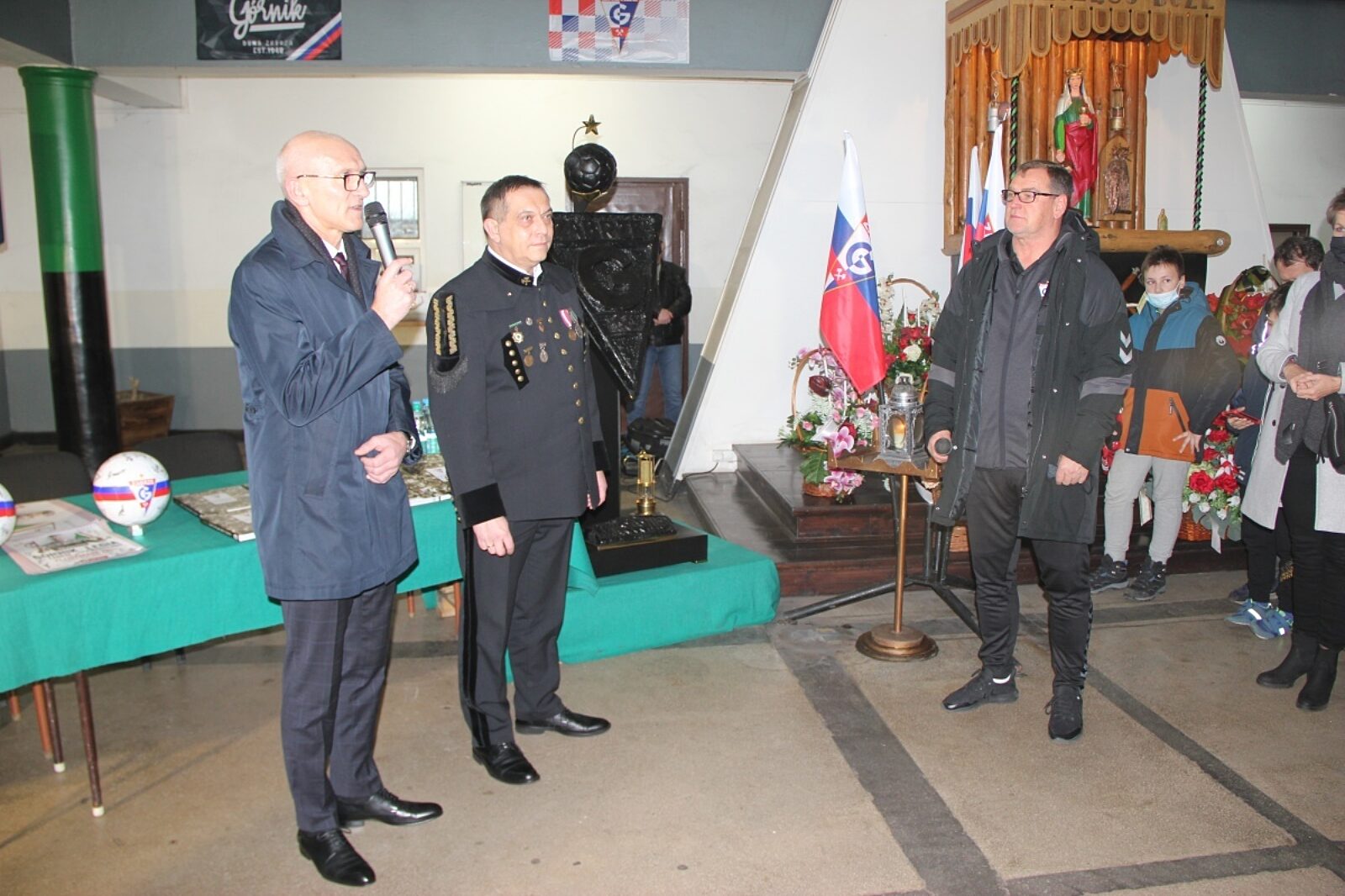 Kibiców zabrzańskiego Górnika powitali w cechowni kopalni Sośnica: Rajmund Horst, wiceprezes PGG, Krzysztof Kiełbiowski, dyrektor kopalni oraz Jan Urban, trener piłkarzy