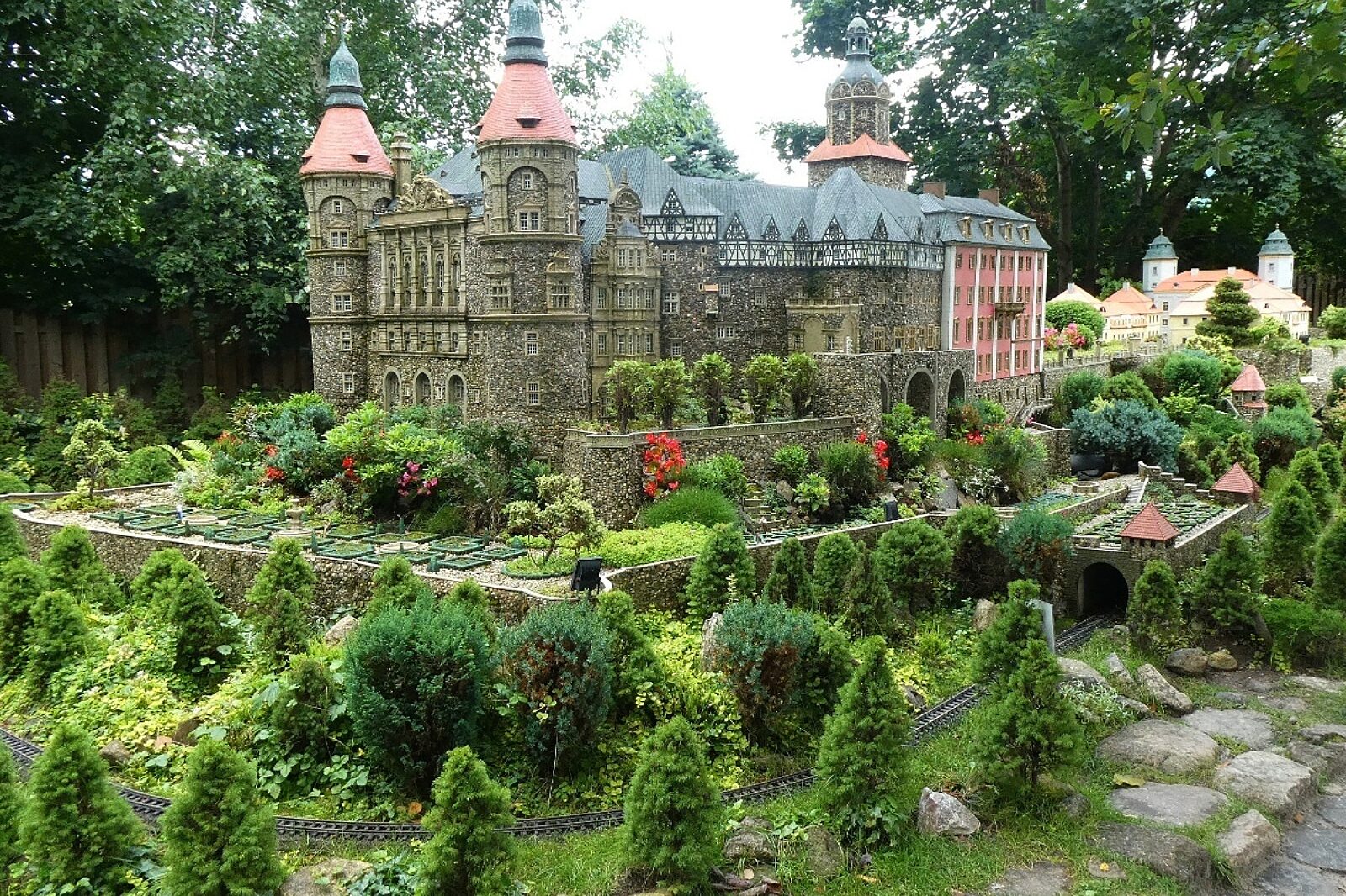 Miniatura zamku Książ w Parku Miniatur w Kowarach z tunelem, do którego wjeżdża złoty pociąg