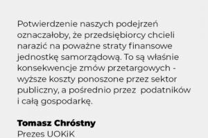 – Potwierdzenie naszych podejrzeń oznaczałoby, że przedsiębiorcy chcieli narazić na poważne straty finansowe jednostkę samorządową. To są właśnie konsekwencje zmów przetargowych - wyższe koszty ponoszone przez sektor publiczny, a pośrednio przez podatników i całą gospodarkę – mówi Prezes UOKiK Tomasz Chróstny.